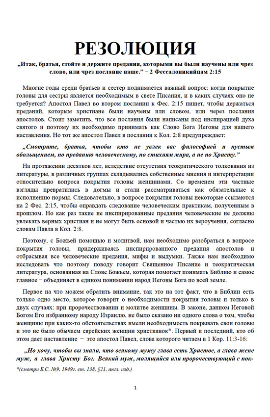 Поэтому, с Божьей помощью и молитвой, нам необходимо разобраться в вопросе покрытия головы, придерживаясь инспирированного предания апостолов и отбрасывая все человеческие предания, мифы и выдумки. Также нам необходимо исследовать что поэтому поводу говорит Священное Писание и теократическая литература, основанная на Слове Божьем, которая помогает понимать Библию и самое главное объединяет в едином понимании народ Иеговы Бога по всей земле.